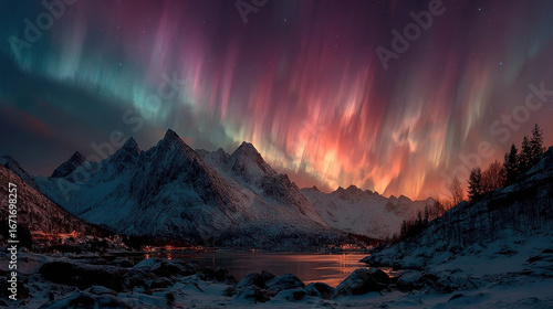 Breathtaking aurora borealis illuminates night sky over majestic snowy mountains, creating magical and serene atmosphere. vibrant colors reflect beautifully calm water below, enhancing enchanting