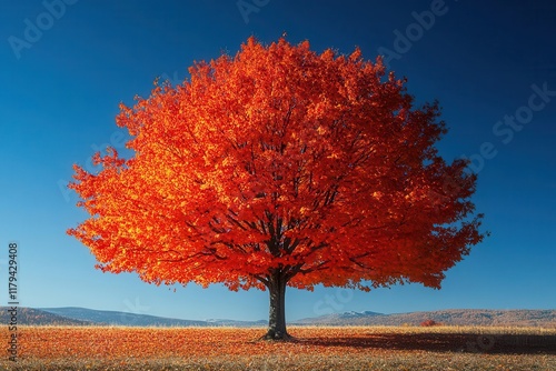 breathtaking autumn sugar maple tree with vibrant red and orange foliage against clear blue sky in peak fall colors