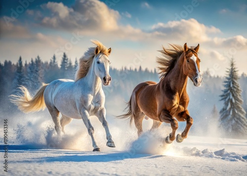 horse, horse, snow, winter, galloping, running, white horse, brown horse, landscape, tree, winter landscape, equestrian, photo, equine, animal, wildlife, nature, outdoors, cold, snowdrift, power, speed, energy, majestic, beautiful, serene, peaceful, white, brown, fur, mane, tail, hoof, glacé, idylli, breathtaking, stunning, image, picture, photo, photograph, hi-res, detailed, realistic, winter scene, cold weather