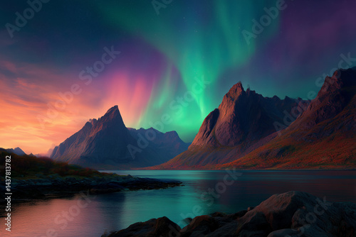 Breathtaking landscape of mountains with vibrant auroras in the sky, surreal colors, fantasy vibes, and UHD details.