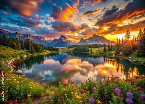 landscape, nature, mountain, sunset, lake, scenery, beauty, calmness, outdoors, wilderness, photo, vibrant, colourful, serene, greenery, wildflower, golden hour, breathtaking, majestic, travel, adventure, scenic, inspiration, peaceful, environment, natural, sky, cloud, horizon, exploration, earth, panoramic, view, picturesque, calm, remote, untouched, hiking, vale, sunlight, landscape, serenity, flora, fauna
