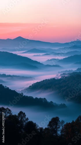 Breathtaking Landscape Sun Rising Misty Mountain. Fog Cascading Down Slopes. Dawn Ethereal Beauty. Soft Pastel Colors.