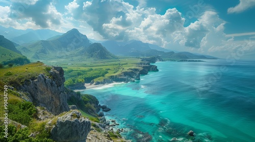 mountain, beach, coastal, landscape, sunrise, nature, turquoise, water, cliff, sky, cloud, scenery, travel, adventure, wilderness, serenity, beauty, calmness, horizon, greenery, ocean, wave, shore, breathtaking, vista, panoramic, exploration, environment, view, coastline, sunny, clear, scenic, destination, park, hiking, relaxation, retreat, escape, point, natural, wild, pristine, majesty, holiday maker, vacation, wildflower, summer