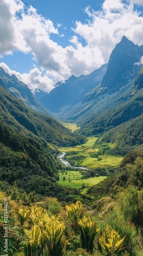 mountain, vale, river, greenery, landscape, nature, sunlight, sky, cloud, scenery, wildlife, peaceful, bright, blue, tropical, exploration, hiking, travel, adventure, serenity, environment, tour tourism, scenic, panoramic, view, flora, fauna, calmness, lush, topography, ecosystem