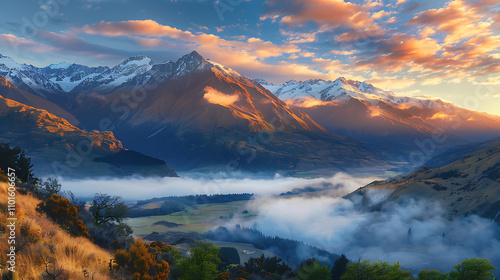 Breathtaking Panoramic View of Majestic Mountains at Sunset, Capturing Vibrant Colors, Dramatic Sky, and Rolling Clouds in a Stunning Natural Landscape Scene