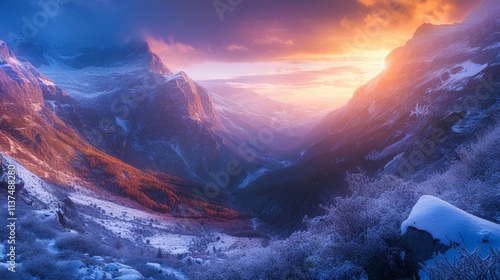 Breathtaking sunrise over majestic mountain valley remote wilderness scenic landscape aerial view nature's beauty