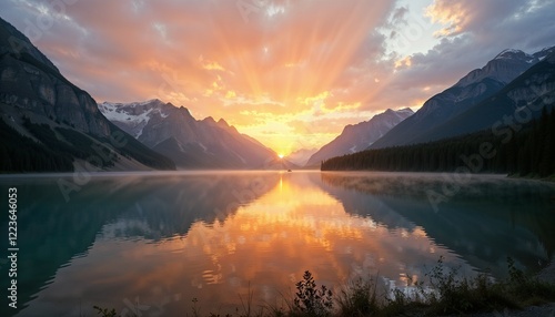 Breathtaking sunset over mountains reflected in a serene lake with rays of light