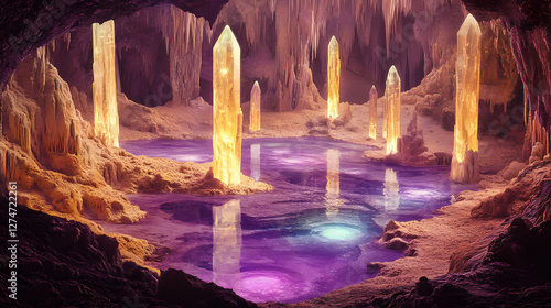breathtaking, fantasy, landscape, towering, crystalline, formation, shimmering, iridescent, pool, vibrant, aglow, enchanted, forest, digital, painting, alien, oasis, illustration