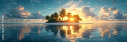 Breathtaking Tropical Sunset over Peaceful Lagoon with Silhouetted Palm Trees