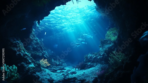 Breathtaking underwater scene with schools of fish, vibrant corals, and sun rays piercing through the ocean blue.