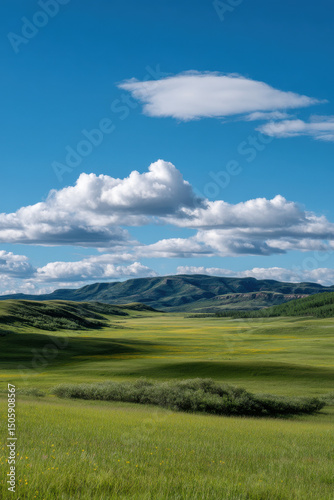 breathtaking, view, sunny, meadow, alberta, filled, wildflower, lush, greenery, sky, clear, blue, few, fluffy, cloud, drifting, gentle, hill, background, creating, serene, landscape, sunlight, scene, glow, beauty, nature, honed, essence, summer, canada, simplicity, minimal, detail, texture, copy space