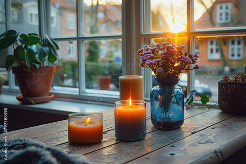 Brennende Kerzen und ein Blumenstrauß in einer Glasvase auf einem Holztisch bei untergehender Sonne, die durch das Fenster scheint.