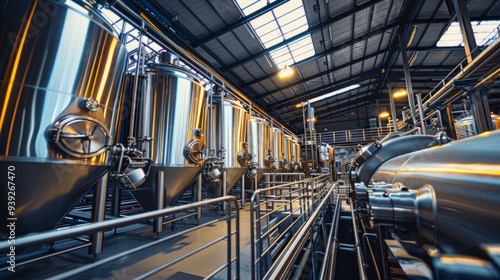 Brewery food industrial production concept. Large reservoirs or tanks in modern beer factory, Pipes stainless steel brewing equipment.