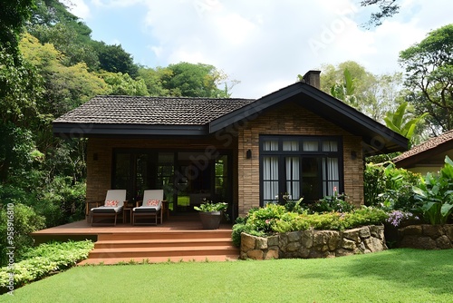 house, brick, patio, landscaping, garden, green, tree, grass, wood, stone, exterior, architecture, design, home, residential, tropical, nature, luxury, vacation, relaxation, peaceful, tranquil, beautiful, view, landscape, modern, style