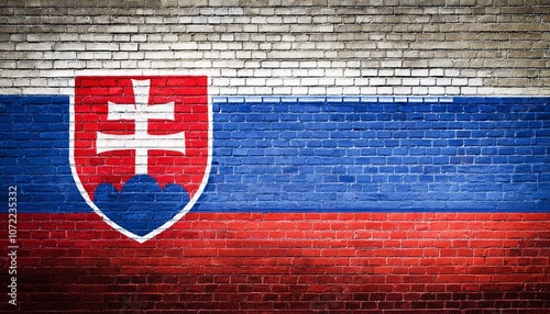 スロバキアの国旗がペイントされたレンガの壁。(Brick wall painted with the Slovakia flag.)