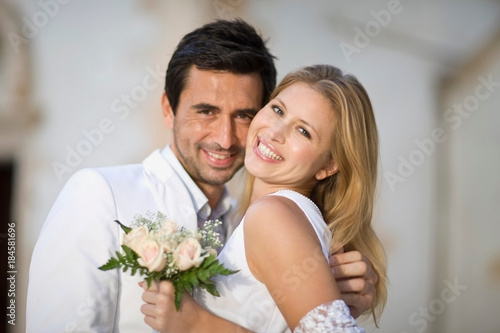 bridal, couple, affection, bouquet, bridal bouquet, bride, bridegroom, carefree, caucasian, celebration, commitment, confidence, day, enthusiasm, eye contact, flower, future, groom, happiness, holding, hugging, husband, love, man, marriage, milestone