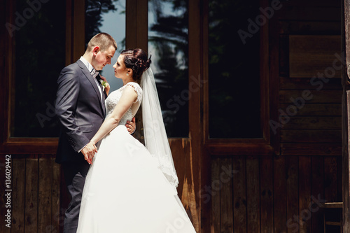 Bride and groom admire each other standing on the porch of old wooden house