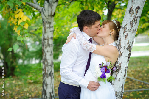 bride and groom in the park, a wedding bouquet, wedding dresses