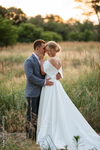 beauty, blue, bride, couple, day, dress, evening, family, fashion, field, garden, girl, groom, ground, guy, nature, plant, row, suit, sunset, together, tree, walk, walk, wedding, white, young
