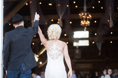 bride, groom, smiling, laughter, wedding, marriage, cowboy hat, hat, country, outdoors, outside, summer, sunny, dress, lace, white, caucasian, love, union, young, sweet, ceremony, tradition, reception, husband, wife, man, woman, barn, back, celebrate, holding hands, proud, entrance, introduce, introduction