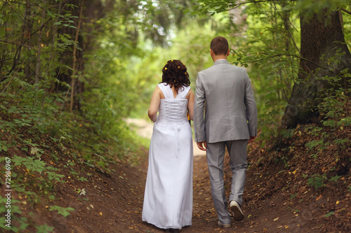 bride and groom wedding walk in park in summer