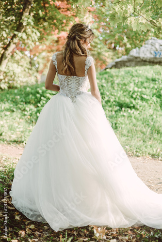 back, tulle, romantic, dreamy, white, wedding, pretty, outside, love, lace, elegant, dress, detail, bride, caucasian, woman, girl, female, person, people, adult, adult, 20s, young adult, young adult, young person, grown-up