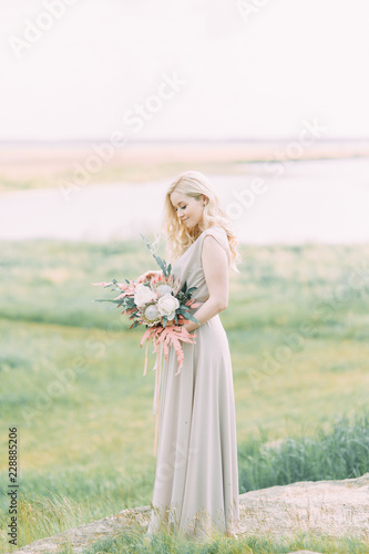 Bride in nature, in the mountains. Wedding in the style of fine art. The mountains and the sunset in the boudoir dress.