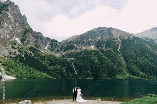 beautiful, rustic, white, romantic, holiday, love, couple, romance, bride and groom, bride, groom, hugging, wedding, young, close, happy, female, woman, cute, happiness, bridal gown, hand, kiss, wedding flowers, mountain, landscape, dress, mountain, view, summer, together, bouquet, lake view