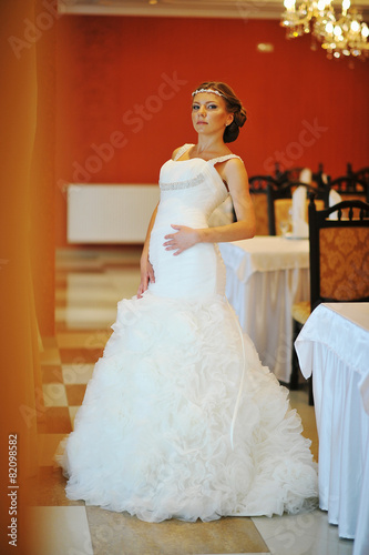 bride with tiara pose at the restauraunt