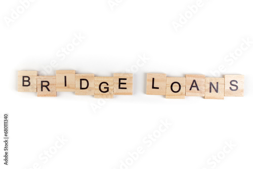 Bridge loans- word composed fromwooden blocks letters on White background, copy space for ad text.