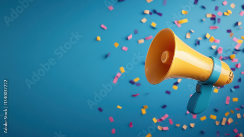 Bright 3D megaphone on blue background with colorful confetti, perfect for celebrations and announcements. This vibrant image captures excitement and joy