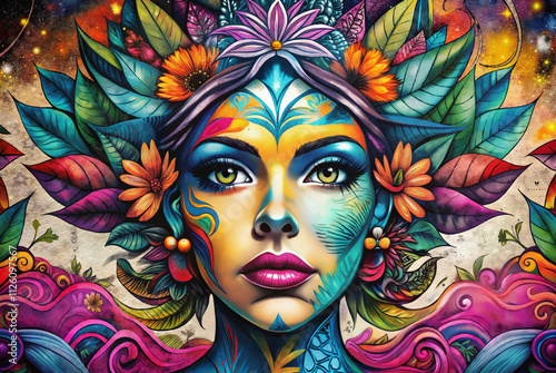 Bright abstract art of a woman with a vivid floral theme