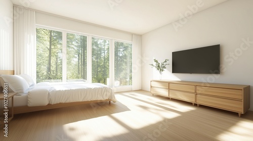 Bright and airy bedroom with large windows and modern decor, serene and inviting feel.