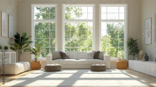 Bright and airy living room with large windows, light decor,