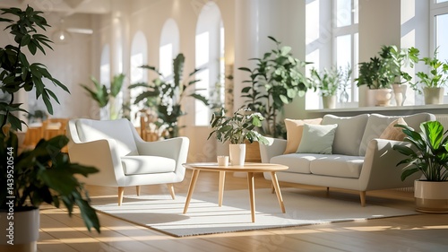 Bright and airy living room with natural light, cozy furniture, and lush indoor plants, creating a refreshing and inviting atmosphere, perfect for home interiors and interior design.