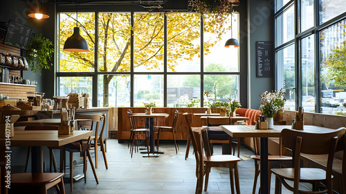 cafes, eatery, interior, modern, empty, chair, table, light, window, city view, daytime, autumn, fall, leaf, tree, wood, wooden, natural, warm, inviting, cosy, quiet, peaceful, serene, waiting, open, business, food, hot drink, tea, beverage, dining, meal, lunch, breakfast, brunch, snack, gathering, social, community, urban, city landscape, architecture, design, style, minimal, clean, bright, airy