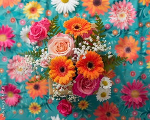 Bright and colorful flowers of different breeds on a blue background with a floral pattern.