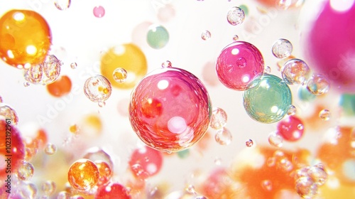 Bright and colorful liquid bubbles of different sizes on a white backdrop