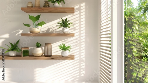 Bright and Fresh Indoor Plant Display on Wooden Shelves with Sunlight