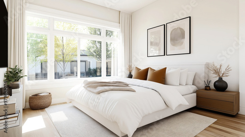 Bright and modern bedroom with large windows, a well-made bed with white and brown pillows, wooden nightstands, decorative vases, wall art, and indoor plants.
