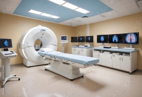 Bright and technologically advanced computed tomography CT scan room featuring a CT scanner, monitors, and other medical instruments.