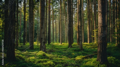 forest, sunlight, tree, greenery, tall, vibrant, serene, vegetation, lush, bright, green, nature, scenic, tranquil, beauty, environment, peaceful, radiant, lively, landscape, wilderness, natural, picturesque, flora, calmness, environmentally friendly, peace, refreshing, solitude, rejuvenating, spring, modern, realistic, forest