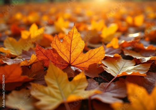 Bright autumn leaves covering a forest floor at sunset in vibrant orange and yellow hues