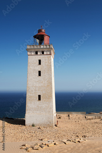 Bright beach sand dunes with the famous danish landmark lighthouse with blue sky background. Rubjerg Knude Lighthouse, Lønstrup in North Jutland in Denmark, Skagerrak, North Sea