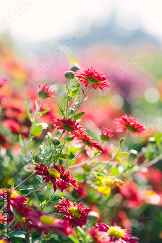 Bright beautiful flowers of red chrysanthemum that grows in the garden on a Sunny day