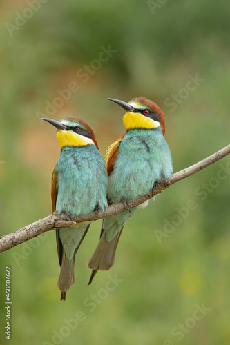 bird, bee-eater, wild, animal, wildlife, environment, fauna, bright, habitat, plumage, creature, nature, tree branch, small, beak, tree, ornithology, tiny, colourful, little, plant, twig, avian, feather, wing, biology, to sit, zoology, perch, birding, exotic, food, together, blurred background, vertical