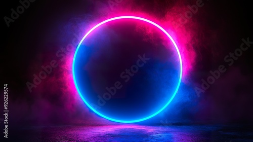 Bright blue and pink neon circle frame against a black background