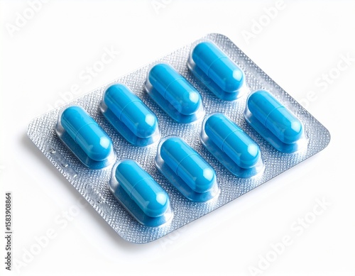 Bright blue capsules neatly arranged in a silver blister pack on a clean white background.