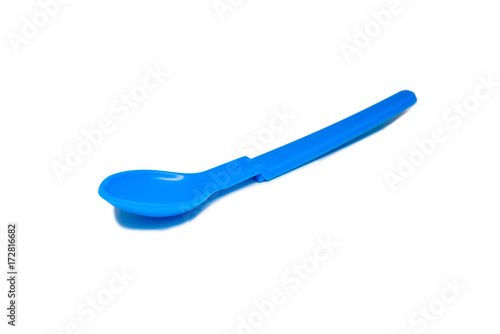 Bright blue plastic baby spoon isolated