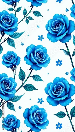 Bright blue roses in a seamless pattern on a white background, elegant, roses
